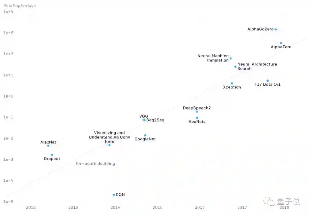 上图中的纵坐标单位是PetaFLOPS×天(以下简写为pfs-day),一个pfs-day是以每秒执行1015次浮点运算的速度计算一天,或者说总共执行大约1020次浮点运算。