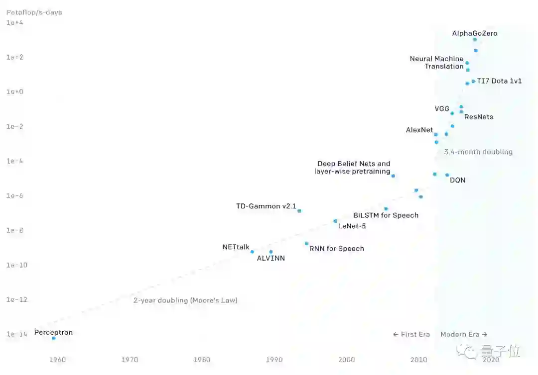 OpenAI还分析了更早期的数据,从第一个神经网络感知器(perceptron)诞生到2012年AI技术爆发前夕的状况。