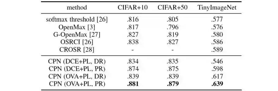 从表4和表5中可看出,相对已有方法,CPN在开放集识别任务中有很大的性能优势。相比已有方法,CPN更加高效,其不需要额外的训练数据,不需要复杂的未知样本判断逻辑,且可进行端到端的训练。