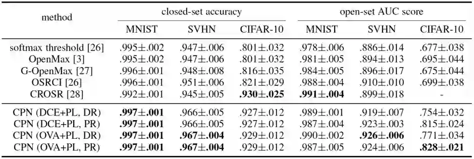 从以上结果可看出,在闭集分类任务上,CPN可取得与CNN相当的分类精度。同时,从表格1和表格2可看出,当引入生成损失(PL)后,CPN的性能可得到进一步提升。从表格2和表格3可看出,CPN同样适用于不同的网络结构和大类别分类场景。从图2中可看出,结合判别和生成损失,CPN可学到类内紧致类间分隔的特征分布,这样的特征更适用于开放集识别问题。