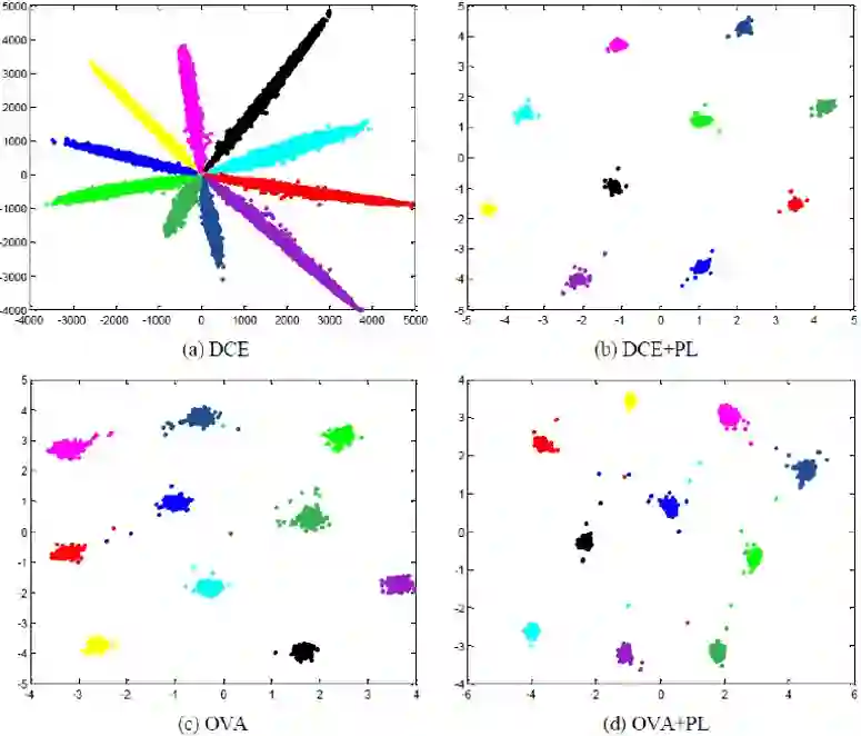 从生成损失的定义中可看出,最小化生成损失可压缩类内特征分布。通过与判别损失配合,CPN可学到类内紧致,类间分隔的特征分布。此种分布可预留更大的空间给未知类,故可提高CPN在开放集识别中的可用性。