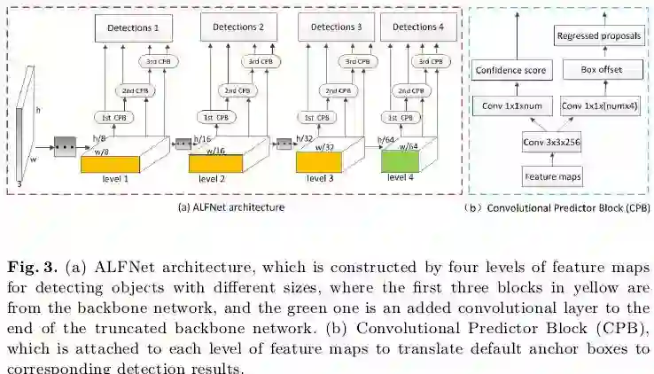 基于以上渐近定位模块(ALF),作者以ResNet-50为基础网络为例,给出了ALFNet检测器的网络架构,如下图3所示,选用ResNet-50的第3、4、5个stage的最后一层(黄色部分)以及新接的一层(绿色部分)作为多尺度特征图(分别较原始图像降采样了8、16、32和64倍),在这些特征图上添加ALF模块,也即堆叠多个CPB(图3(b))。训练和测试和通用目标检测器类似,详情可见论文。