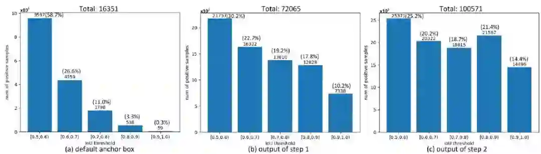 对于训练而言,ALF的优势体现在能够使得后面的预测器获得更多质量更高的正样本,文中通过下图进行了展示,可以发现对于初始目标候选框(a)而言,随着IoU阈值的提升,能够匹配上的正样本数量逐渐减少,经过ALF第一步后,不同阈值下的正样本数量均显著上升,经过ALF第二步后,这一趋势更为明显,而且在不同阈值下的正样本数量更为均衡,这就增加了训练时正样本的多样性,另外,正样本总数量也从原始的16351上升到了100571,约增加了5倍。