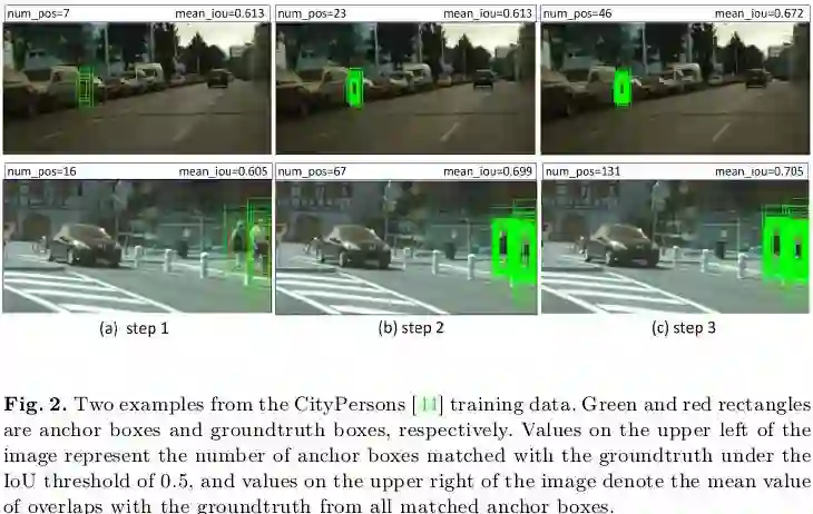 式(6)完成了对前面输出的anchors进行进一步回归,这样在训练时后面的预测器就可以得到更多质量更高的正样本,如下图2所示:两个例子中,第一步时初始目标候选框只有7和16个被匹配为正样本,到第二步时正样本数量提升到23和67,同时平均IoU也得到了一定提升,以此类推第三步时就拥有了更多的正样本。