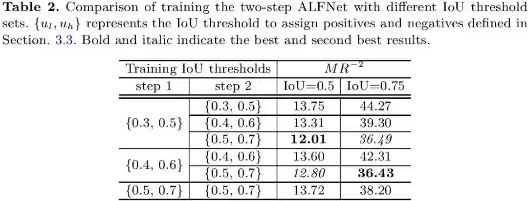 拥有数量急剧上升的正样本,使得利用更高IoU阈值训练检测器成为可能,为此作者做了不同IoU阈值训练的验证实验,如表2所示,以两步的ALFNet为例,实验表明利用提升的IoU阈值训练(从{0.3, 0.5}到{0.5, 0.7})得到了最佳检测性能,这一点和Cascade R-CNN[1]中得到的结论是一致的。