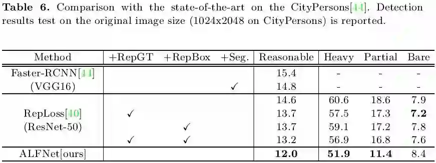下表6展示了在CityPersons上的性能对比,其中heavy partial bare代表不同的遮挡程度,可以发现ALFNet在Reasonable设定下获得了较其他两种方法更优的性能。值得注意的时,在严重遮挡情况下的miss rate也远优于专注于遮挡问题的RepLoss,充分说明ALFNet具备更高的定位精度,因而能够更好地完成自遮挡严重情况下的行人检测。