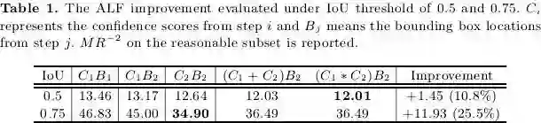 首先我们看下本文的核心模块ALF对检测性能带来的提升,如下表1所示,在IoU=0.5评估设定下ALF使得miss rate下降了1.45提升为10.8%,而在IoU=0.75评估设定下miss rate则下降了11.93,充分验证了ALF可以带来更高的定位精度。