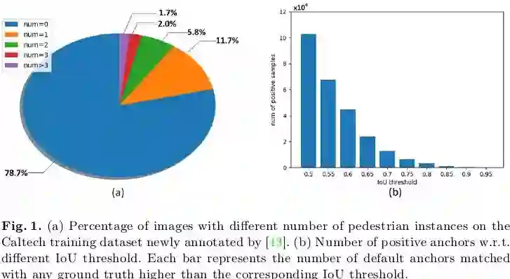 此外作者认为:基于SSD的单阶段检测器在行人检测上表现不佳的另外一个原因是训练时只能选取单一的IoU阈值定义正负样本。一个较低的IoU阈值(比如0.5)有利于获得足够的正样本,特别是在当前行人检测数据集中行人样本本身就很有限的情况下,如下图1(a)所示,在Caltech训练集中没有行人样本的图片占了78.7%,只有一个行人样本的图片占了11.7%,可是训练时采用较低的IoU阈值会导致测试时产生大量”close but not correct”虚检,这一点在Cascade R-CNN[1]中也有提到,但如果训练时采用一个较高的IoU阈值(比如0.7)则会导致匹配上的正样本会非常少,如下图1(b)所示,随着IoU阈值的提高,匹配上的正样本数据急剧下降,这种定义正负样本的两难问题使得训练一个高精度的SSD非常困难。