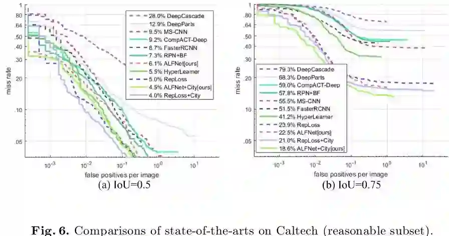 下图6展示了在Caltech上的性能对比,可以发现在IoU=0.5评估设定下ALFNet的表现劣于RepLoss,但在IoU=0.75评估设定下ALFNet取得了最佳性能,miss rate比之前最好结果低了2.4个百分点,再次证明ALFNet在定位精度方面的优势。