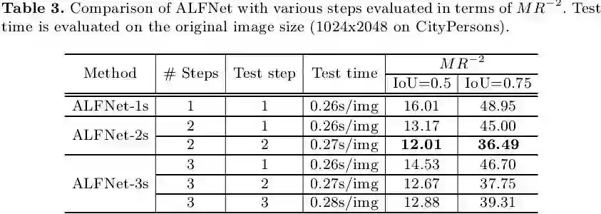 既然ALF能够提升检测性能,是不是意味着堆叠越多的步数就会得到更好的结果?作者对此做了验证实验,如下表3所示,从miss rate的评估结果来看,堆叠3步时性能就达到饱和了,2步的ALFNet取得了最佳性能,这一点和Cascade R-CNN[1]中的结论也是类似的。然而通过对TP和FP做进一步分析时作者发现3步的ALFNet获得了比2步的ALFNet更好的性能(详见论文表4)。另外值得注意的是,每增加一步,ALFNet在1024x2048的图像上的算法耗时仅增加0.01s,相对而言是一种比较经济的解决方案。