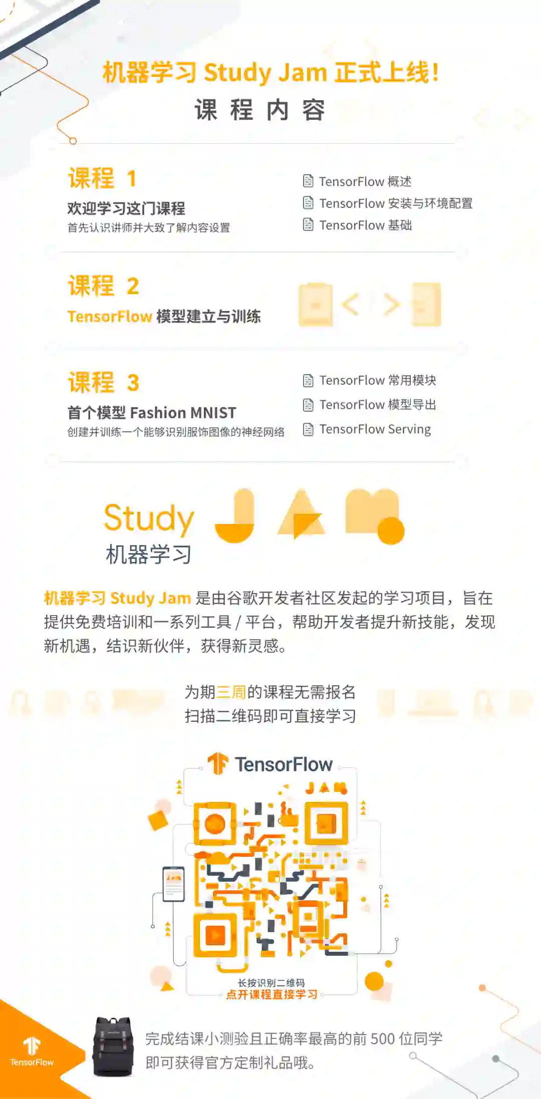 作为由 GDE 打造的 TensorFlow 中文课程,本课程包含机器学习的基本原理和应用。你将学到如何用 TensorFlow 构建神经网络,搭建基础模型,解决不同场景下的简单问题。课程答疑 (Office Hour) 将由 GDE 李锡涵和李卓桓分别进行。