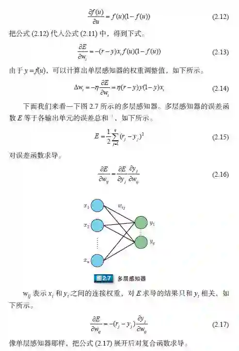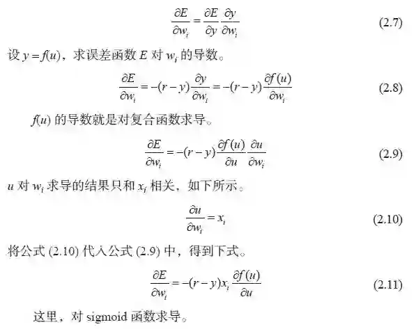 为了让大家更好地理解误差反向传播算法的过程,下面我们首先以单层感知器为例进行说明。根据复合函数求导法则,误差函数求导如下所示。