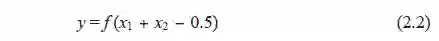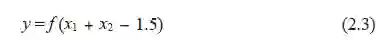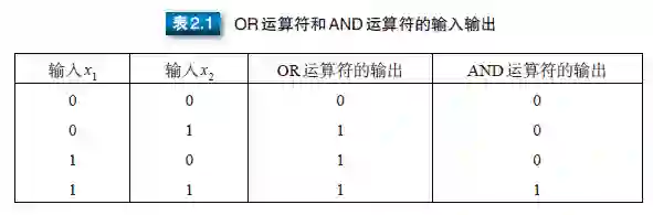 逻辑或(OR 运算符)和逻辑与(AND 运算符)可以使用图 2.3(b) 所示的双输入单输出 M-P 模型来表示。各运算符的输入与输出的关系如表 2.1 所示。根据表中关系,以 OR 运算为例时,公式 (2.1)中的 wi 和 h 分别为 w1 = 1, w2 = 1, h = 0.5,把它们代入公式 (2.1) 可以得到下式。
