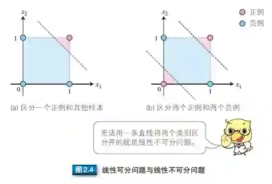 使用误差修正学习[21],我们可以自动获取参数,这是感知器引发的一场巨大变革。但是,感知器训练只能解决如图2.4(a) 所示的线性可分问题,不能解决如图2.4(b) 所示的线性不可分问题。为了解决线性不可分问题,我们需要使用多层感知器。