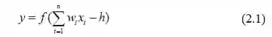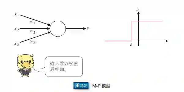 M-P 模型是首个通过模仿神经元而形成的模型 [43]。如图 2.2 所示,在 M-P 模型中,多个输入节点 {xi | i = 1, ..., n} 对应一个输出节点 y。每个输入 xi 乘以相应的连接权重 wi,然后相加得到输出 y。结果之和如果大于阈值 h,则输出 1,否则输出 0。输入和输出均是 0 或 1。