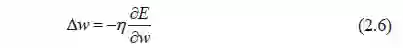 接着再来看一下权重调整值。根据上述说明,权重需要进行调整以使最小二乘误差函数趋近于 0。对误差函数求导就能得到图 2.6 中给定点的梯度,即可在误差大时增大调整值,误差小时减小调整值,所以连接权重调整值 Δw 可以用公式 (2.6) 表示。