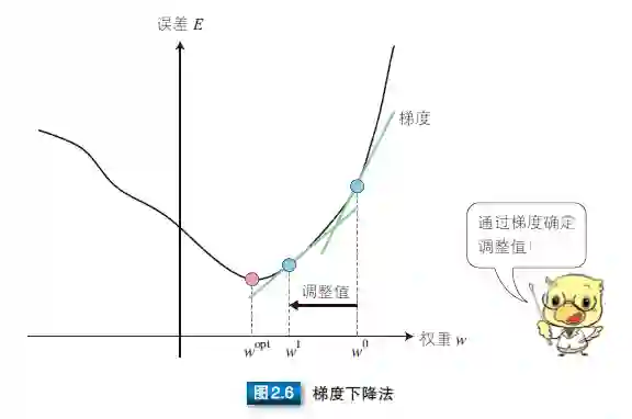 多层感知器中,输入数据从输入层输入,经过中间层,最终从输出层输出。因此,误差反向传播算法 [57] 就是通过比较实际输出和期望输出得到误差信号,把误差信号从输出层逐层向前传播得到各层的误差信号,再通过调整各层的连接权重以减小误差。权重的调整主要使用梯度下降法(gradient descent method)。如图 2.6 所示,通过实际输出和期望输出之间的误差 E 和梯度,确定连接权重 w0 的调整值,得到新的连接权重 w1。然后像这样不断地调整权重以使误差达到最小,从中学习得到最优的连接权重 wopt。这就是梯度下降法。