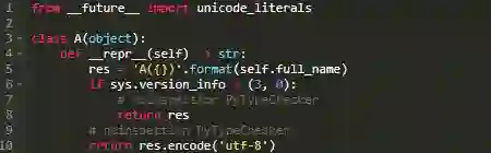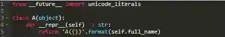 这段代码是有bug的。在python3下运行是正确的,但在python2下不行,这是因为在python2环境中,解释器期望__repr__方法返回bytes类型的数据,然而Unicode_literals的引入使得返回值实际上为unicode类型的。本例中,将下一个版本的新特性引入意味着不可能编写一个同时满足python2和python3的类型需求的__repr__方法。你需要加入运行逻辑来使代码做正确的事情: