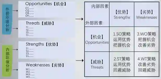 内部因素 + 外部因素就构成了企业(产品)战略,所以企业(产品)战略的公式为:企业(产品)战略=内部因素(SW)+ 外部因素(OT)