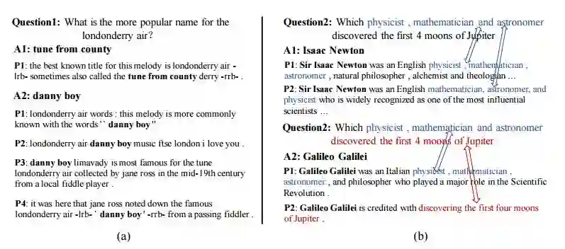 摘要:A popular recent approach to answering open-domain questions is to first search for question-related passages and then apply reading comprehension models to extract answers. Existing methods usually extract answers from single passages independently. But some questions require a combination of evidence from across different sources to answer correctly. In this paper, we propose two models which make use of multiple passages to generate their answers. Both use an answer-reranking approach which reorders the answer candidates generated by an existing state-of-the-art QA model. We propose two methods, namely, strength-based re-ranking and coverage-based re-ranking, to make use of the aggregated evidence from different passages to better determine the answer. Our models have achieved state-of-the-art results on three public open-domain QA datasets: Quasar-T, SearchQA and the open-domain version of TriviaQA, with about 8 percentage points of improvement over the former two datasets.