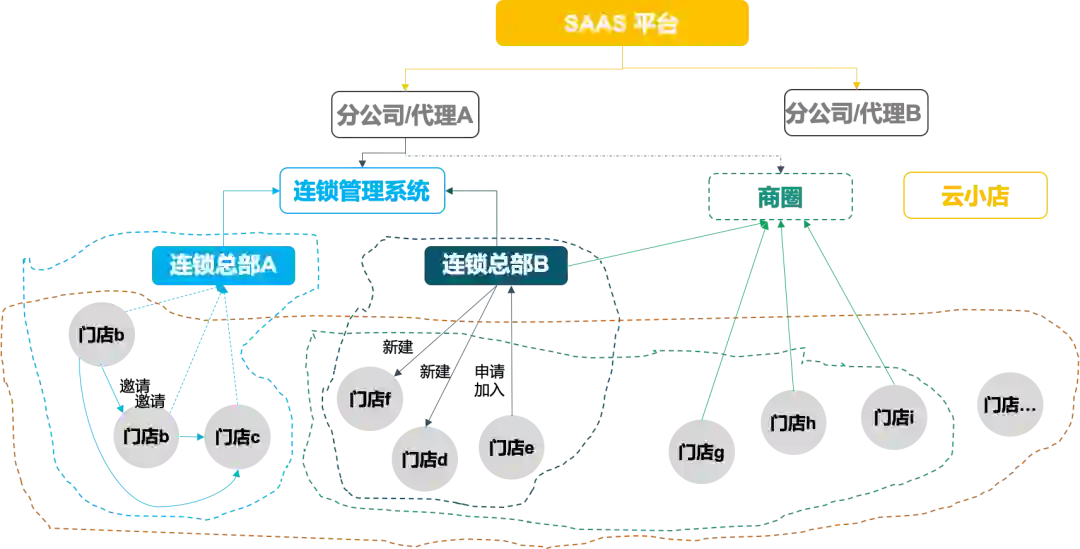 群(连锁、商圈、联盟等)、个人门店都存在于SaaS平台(微信)。