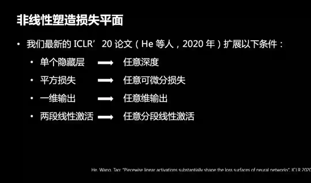 我们今年在ICLR 2020的文章中,显著扩展了这四个条件:1.任意深度;2.任意可微分损失;3.任意维输出;4.任意分段线性激活。