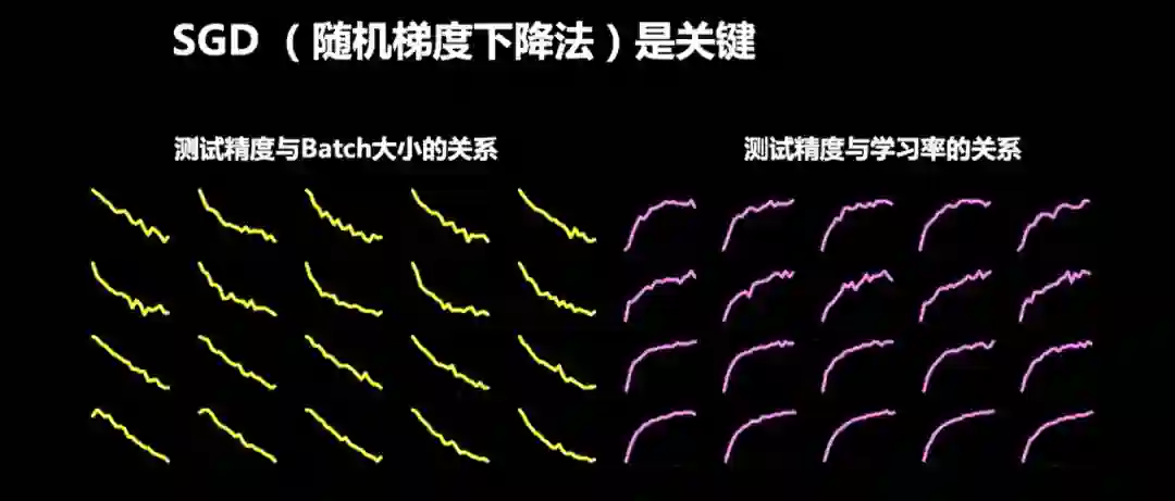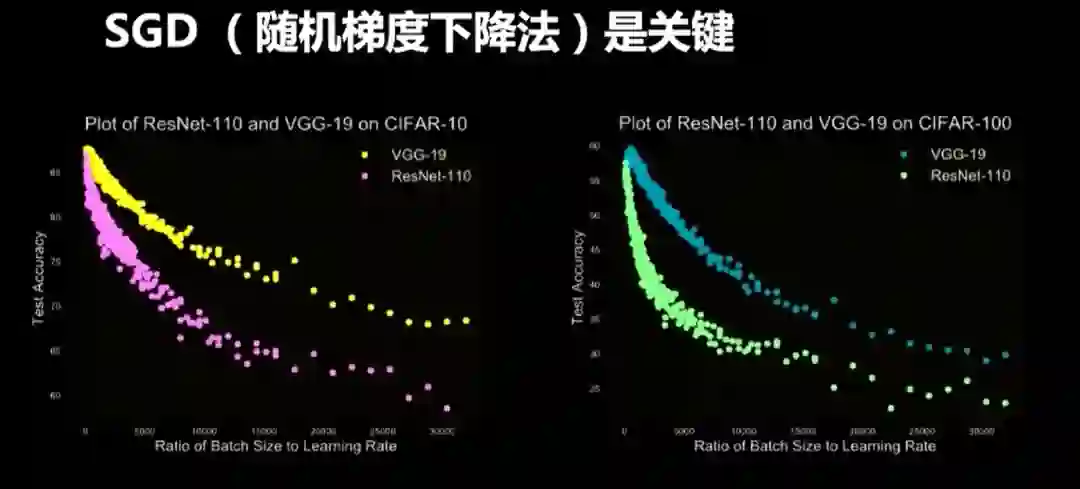 我们在CIFAR-10和CIFAR-100上基于ResNet和VGG两个网络训练了1600个模型,来验证“正相关”关系。上图是所有模型的测试精度分析,每一个小图由20个模型画成。我们用测试精度表示泛化能力,因为训练精度几乎是100%。左边显示学习率不变的条件下,测试精度和Batch大小之间的关系:随着Batch Size的增加,测试精度下降。右边是Batch Size不变的条件下,测试精度和学习率之间的关系:随着学习率的增加,测试精度提升。