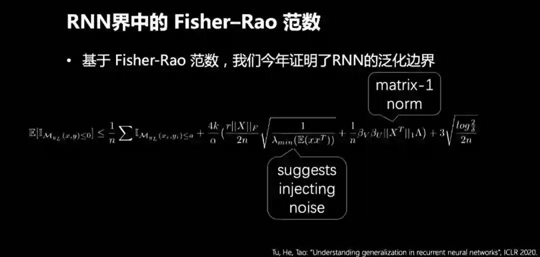 今年,我们团队在ICLR 2020中发表了一篇使用Fisher-Rao范数证明RNN的泛化边界。Fisher-Rao和matrix-1 norm可以有效的帮助我们控制上限的尺度。这给我们带来的启发是: