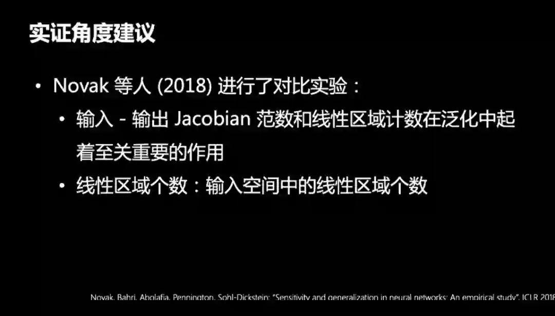 在2018年Novak等人用实验说明:神经网络的泛化性能和损失曲面的几何结构相关:神经网络的泛化性能和输入空间的区域个数相关。
