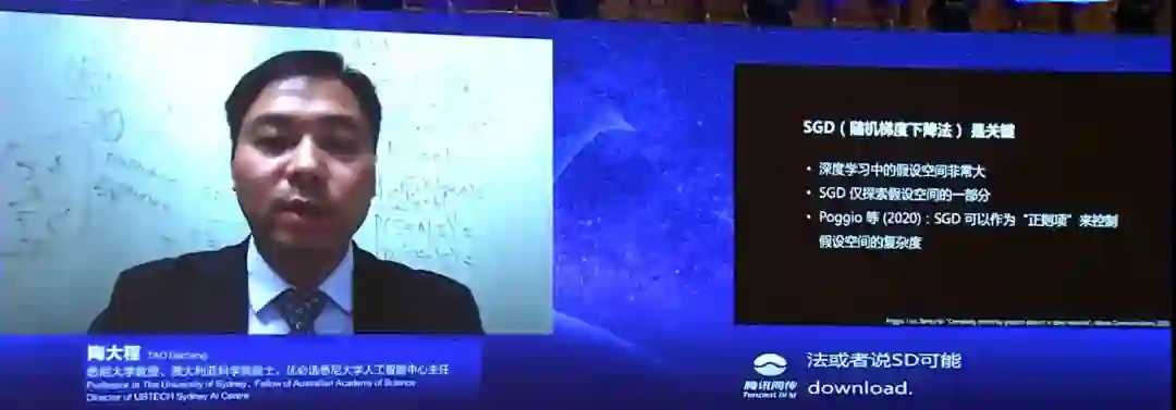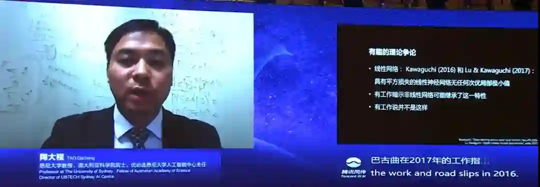 在报告中,陶教授回顾了深度学习理论的发展,并介绍了最近在深度学习理论研究方面的进展,具体包括,为什么深层结构优于浅层结构?为什么随即梯度下降算法对于理解深度学习的泛化能力非常重要?以及深度学习模型的损失曲面有什么样的几何性质?
