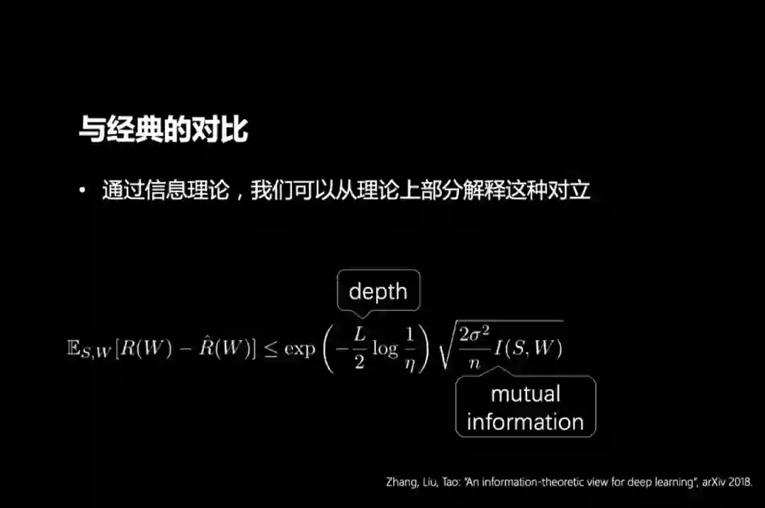 从信息论的角度出发,我们团队得到了一个泛化误差的上界。其中的理论分析主要基于三个方面,首先和传统的浅层学习模型,例如支撑向量机不同,深度神经网络具有层级特征映射结构,这样的层级结构能有效帮助网络避免过拟合。
