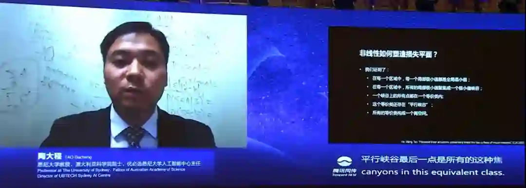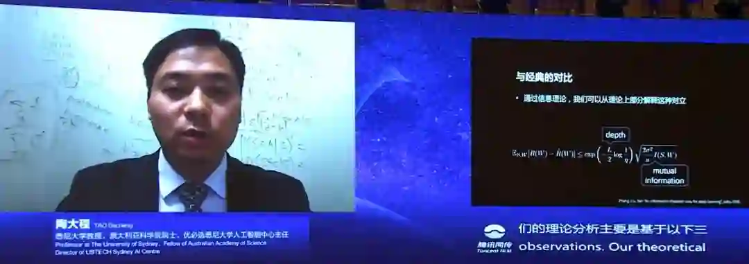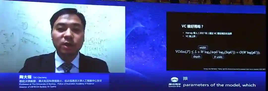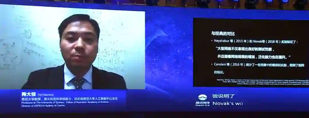 2020年7月9日,在世界人工智能大会上,陶大程教授(澳大利亚科学院院士)在科学前沿全体会议上和观众连线,并做了《预见·可信 AI》的报告。