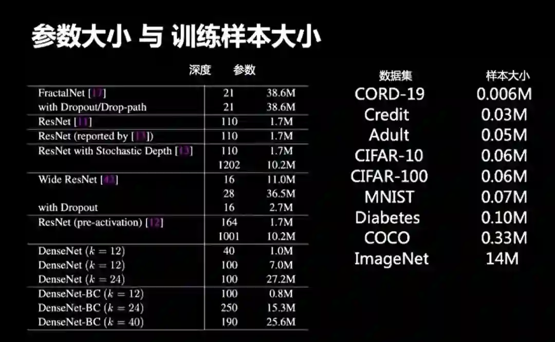 那么深度学习的情况是什么样的呢?如上图对比,左边是2017年效果最好的神经网络,大概有几千万个参数;右边是现在常用的数据集,CORD-19数据库只有6000个数据点。ImageNet作为机器视觉领域最大的数据库之一仅有1000多万个数据点。其他大多机器视觉领域的数据集只有几万个数据点。即使是ImageNet这样的大规模数据库,与深度学习的参数相对比,数量仍然不足。
