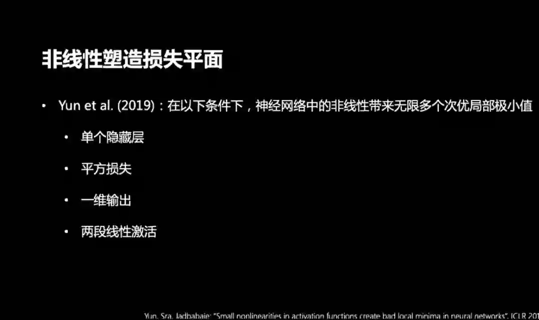 在2019年,Yun等人证明了单层的神经网络损失曲面有无穷多的次优局部极小值。此结论需要有4个条件保证:1.单个隐藏层;2.平方损失;3.一维输出;4.两段线性激活。