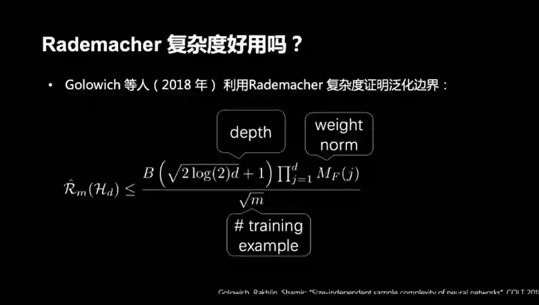 2018年,Golowich等人用Rademacher复杂度得到了一个泛化误差的上界。结论表示:上界不直接与模型的规模相关,但是和模型参数的模以及网络的深度相关。