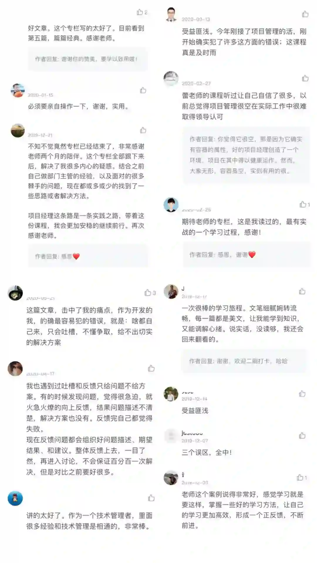 说实话,我的项目在研发过程中遇到不少困难,甚至有的同学不看好这个项目,于是就选择离开了,我自己一度非常沮丧。而这个专栏,让我在项目的不同阶段,都能看到对应的解读,给了我不少新思路,增强了对项目全局的把控性。此外,我也重新梳理了自己项目的问题,确立了中短期的项目目标,真心感谢蓓蓓姐。