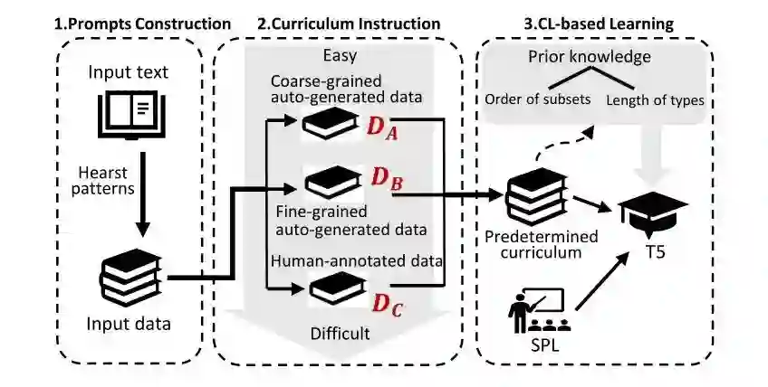 然而 PLM 存在的问题是无论最终是否在细粒度数据集上进行微调,都倾向于生成高频但粗粒度的类型,因此该范式引入课程学习(CL)的思想,仅需为模型提供少量人工标注数据和大量自动生成的低质量数据组成的异构数据,采用自步学习的方法,依靠课程对类型粒度以及数据异构型的理解自我调整学习进度,使 PLM 生成高质量的细粒度类型。