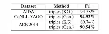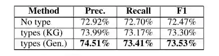 代表性实体链接模型 DCA-SL(Yang et al,2019)采用 KG 中的实体描述和三元组作为外部知识,以提高模型在实体链接任务中的性能。为了证明我们的模型生成的类型是高质量的,我们首先采用我们的模型为基于文本的实体生成类型。然后我们用生成的类型替换 KG 中原始三元组中的类型。