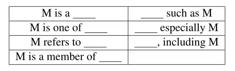 表 1 是基于 Hearst patterns 构建的 prompts,每个输入文本 X 与通过实体 M 构造的 prompt 相连作为模型的 input_data,要求 PLM 填充 prompt 中的空白。例如:输入“In the early 1980s, P&G tried to launch here a concentrated detergent under the Ariel brand name that it markets in Europe. P&G is a ”,输出“large detergent company”,“large detergent manufacturer”和“company”作为实体“P&G”的类型。