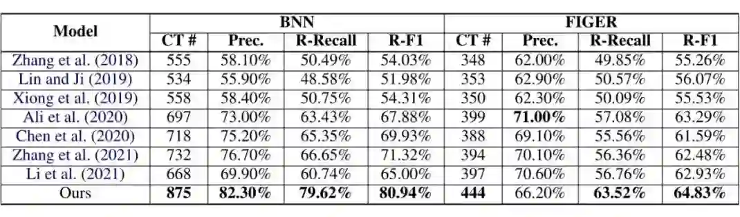 实现结果如表 3 所示,对于 BNN,GET 模型显著改进了 Precision;对于 FIGER,GET 模型能生成比 baseline 更多的实体类型;由表 4 可知,对于 Ultra-Fine,GET 模型大大提高了 Precision 并涵盖了更多的实体类型。
