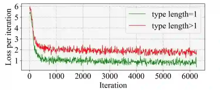 课程学习需要估计样本难度来确定使用样本进行模型训练的顺序,采取先简单后困难的顺序进行学习。首先,我们根据自动生成的数据类型的长度生成两个大小相同的训练样本子集:子集 A 的类型长度为 1,子集 B 的类型长度 ≥2,然后分别在 A 和 B 上训练 T5 并记录 loss。如图 4 所示,子集 B 具有更弱的收敛性和更高的交叉熵损失,这表明 PLM 更难拟合细粒度类型的训练样本。