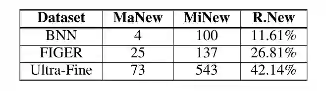 同时,GET 模型具有生成预定义类型集以外新类型的能力,MaNew 是在预定义类型集中生成的类型总数,MiNew 是每个实例的人工注释类型集(golden labeled set)之外生成的类型总数,R.New 是每个样本新生成类型的比率。列出的结果基于不同数据集中的测试集,如表 5 所示,我们的模型可以生成大量 golden labeled set 中没有的类型,增加实体类型的多样性。