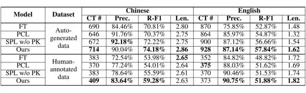 我们还进行了消融实验,将模型与采用 FT,PLC,没有先验知识的 SPL(SPL w/o PK)的模型进行比较,其中 FT 直接在训练数据上进行微调,PCL 采用固定的课程指导模型学习,SPL w/o PK 采用无先验知识的 SPL。如表 6 所示,PCL 和 SPL 相对于 FT 能够生成更多实体类型且具有更多的细粒度类型,验证了 CL 的有效性。
