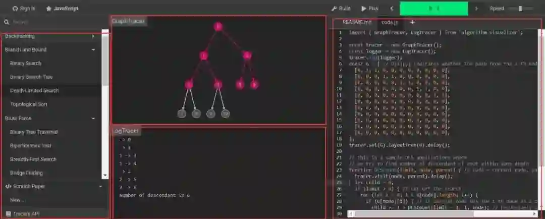 下面通过depth limited Search,大概解释一下 Algorithm Visualizer 这个工具: