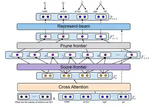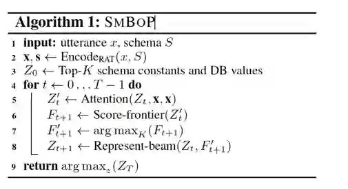 SMBOP 类似于波束搜索,因为在每个步骤中它都拥有固定高度的前 K 棵树。它也与(修剪的)图表解析有关,因为步骤 t + 1 处的树是根据在步骤 t 找到的树计算出来的。这与序列到序列模型不同,在序列到序列模型中,光束上的项目是相互竞争的假设,没有任何交互。