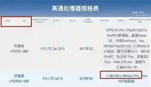 但是这款手机却是存在的。日前有网友分享了一张图片,在图片中出现了一款名为“小米Max 3 Pro”的手机。从这张“高通处理器规格表”中可以看到这款机型和小米8 SE一起出现,该款新机发布的时间为2018年Q2。