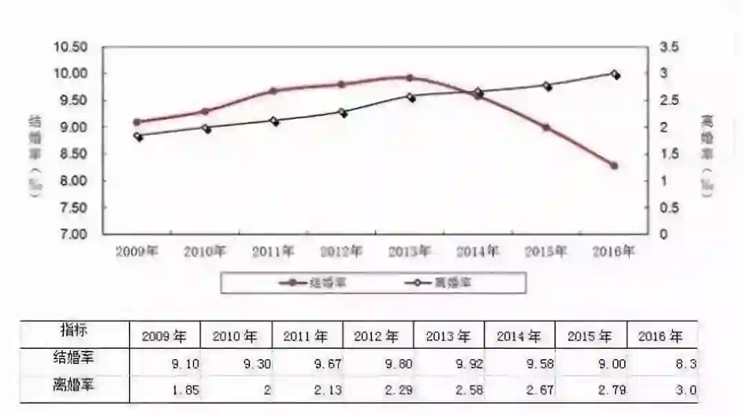 图中红色曲线为结婚率,黑色为离婚率