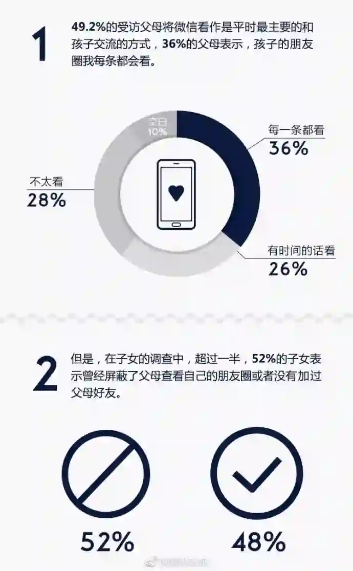 无独有偶,前几日,腾讯新闻调查制作的《朋友圈年度亲情白皮书》显示,受调查的1209个子女中,52%的人表示曾经在朋友圈里屏蔽过父母,或者没有加他们为好友。