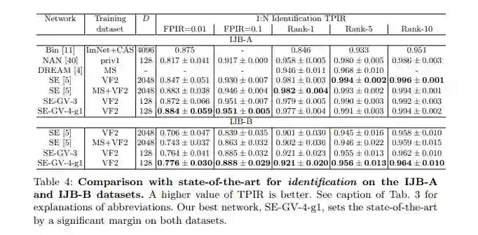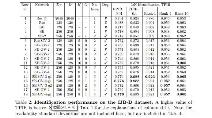 如下图中Table 3和Table 4,在IJB-A和IJB-B上比较验证和识别结果,同样所提算法精度也胜出不少,请注意作者使用的训练集比其中很多state-of-the-art算法规模要小,但依然实现性能超越!
