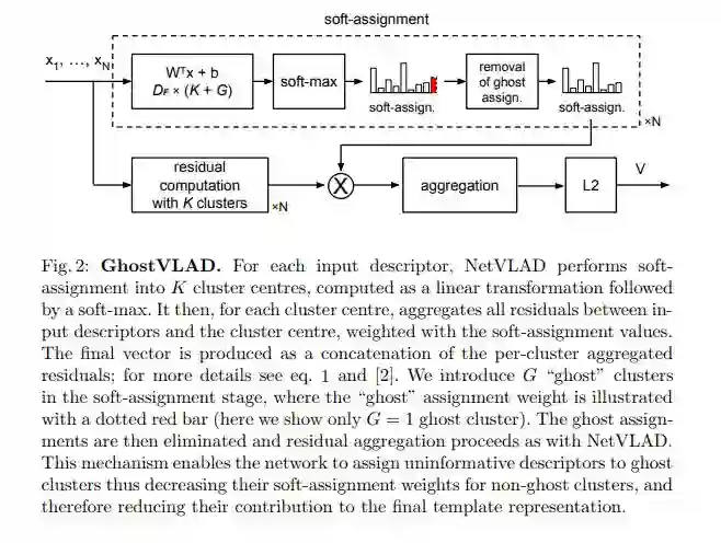 由上述公式得知,NetVLAD中所有聚类中心ck都参与了聚合,GhostVLAD的改进则是增加聚类中心的个数到K+G,但是增加的聚类中心在构建聚合特征矩阵的时候不参与贡献权重。